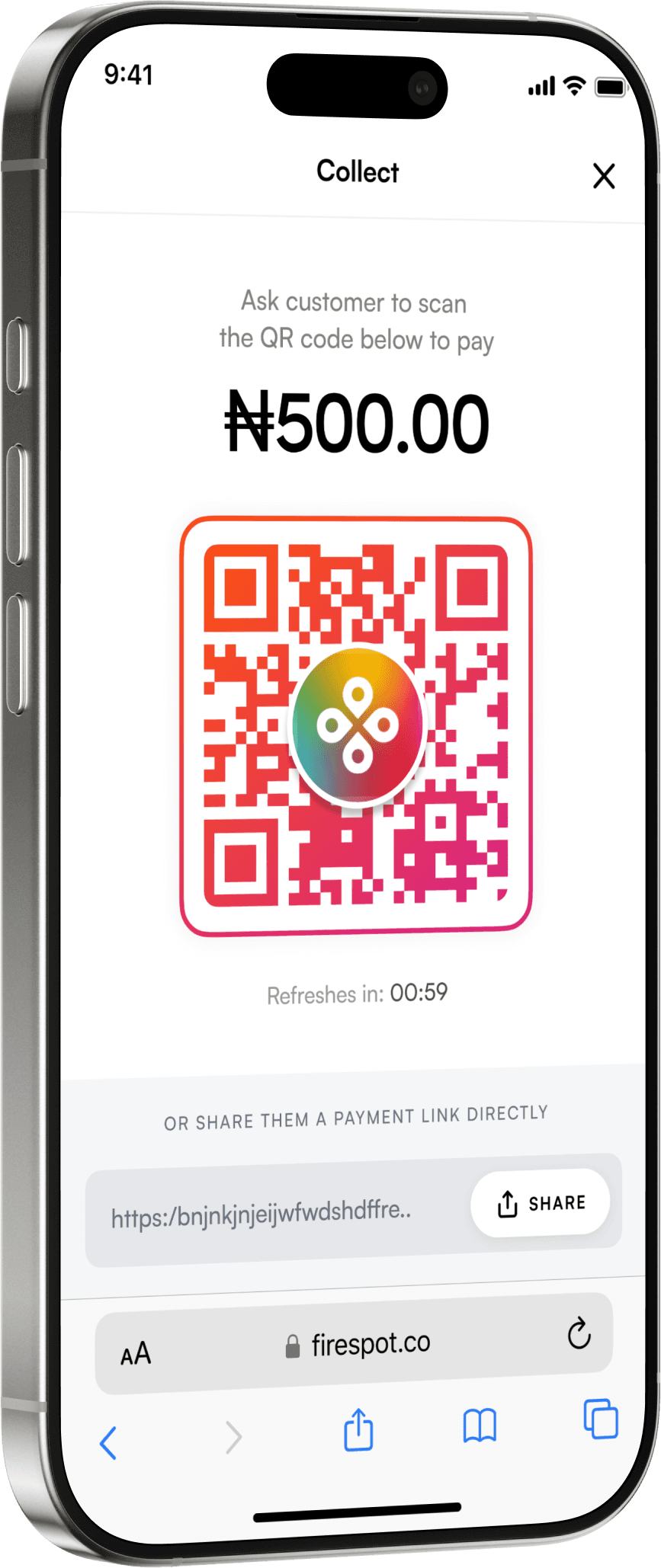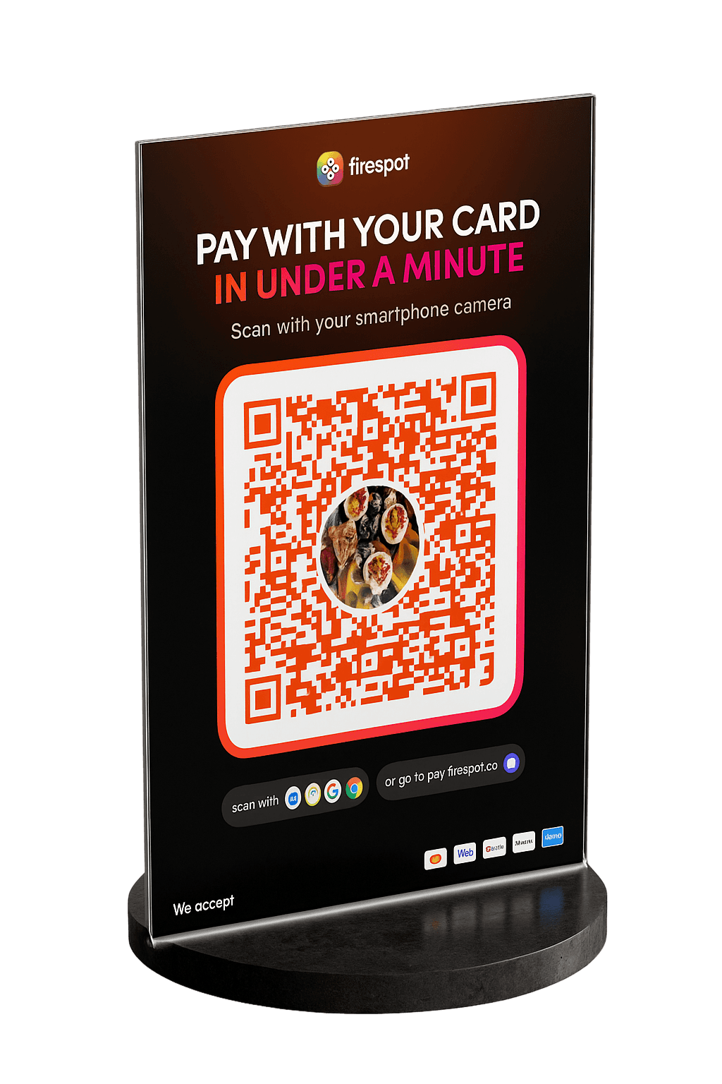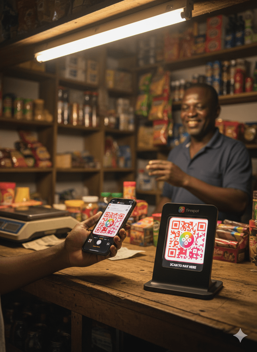 A physical QR code linked to your Firespot business profile. Customers scan, pay with their preferred method, and stay connected automatically.